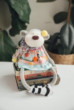 5. Strong craft thread, Upholstery/Beading Thread, matching sewing thread, embroidery thread for eyes and mouth, red beeswax crayon to blush cheeks.